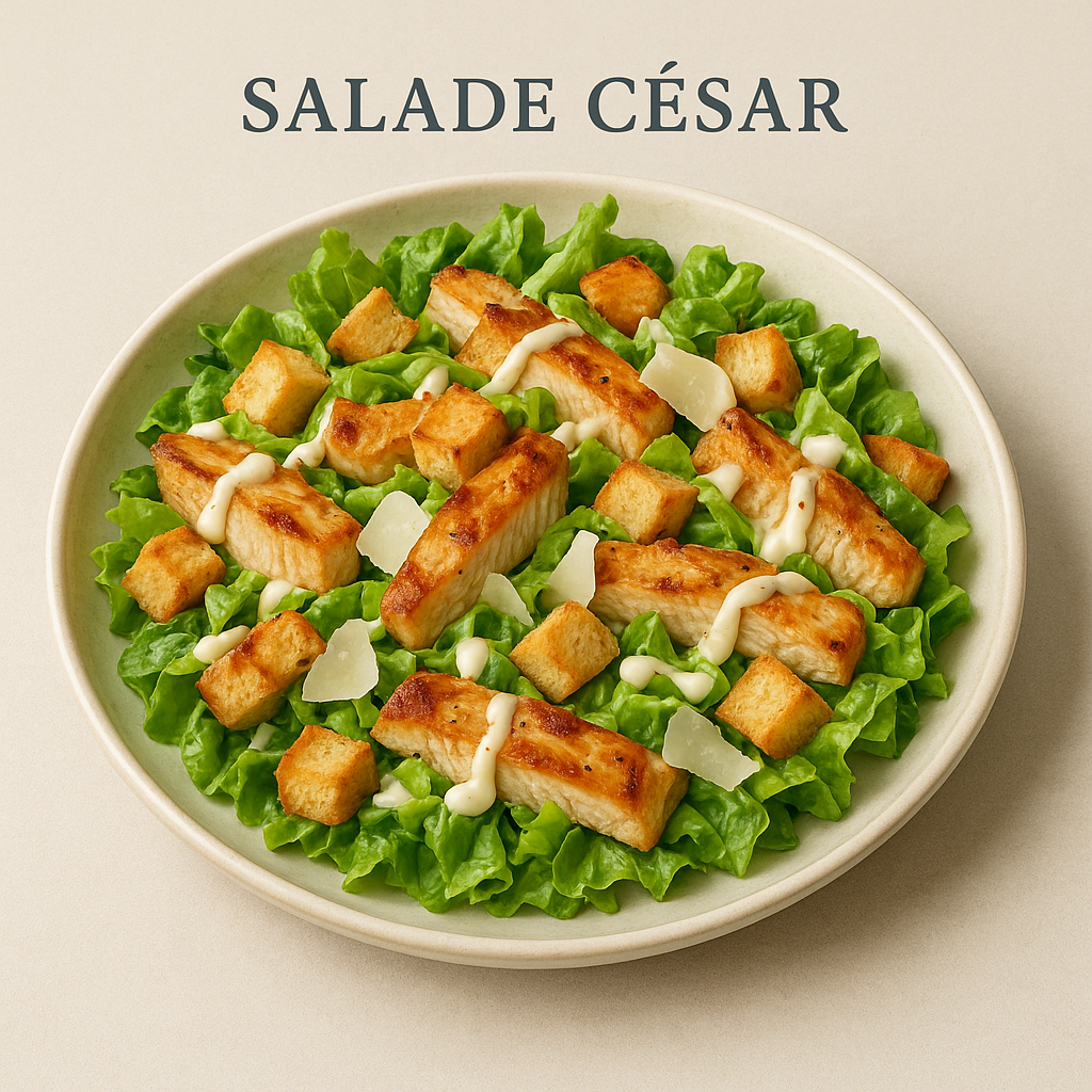Laitue romaine, poulet grillé, copeaux de parmesan, croûtons, sauce césar.